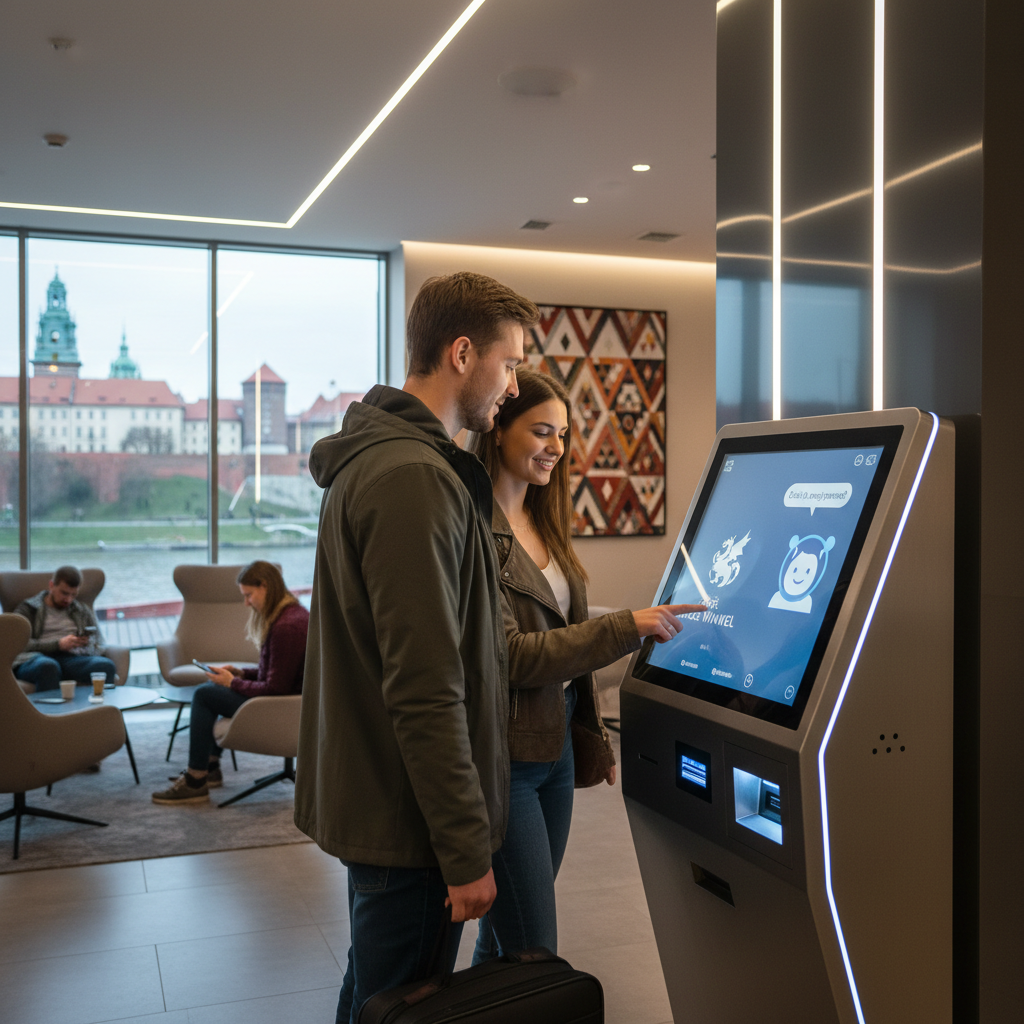 Nowoczesna recepcja hotelowa z samoobsługowym kioskiem i chatbotem obsługującym gości hotelowych, Polska