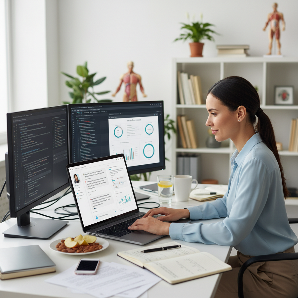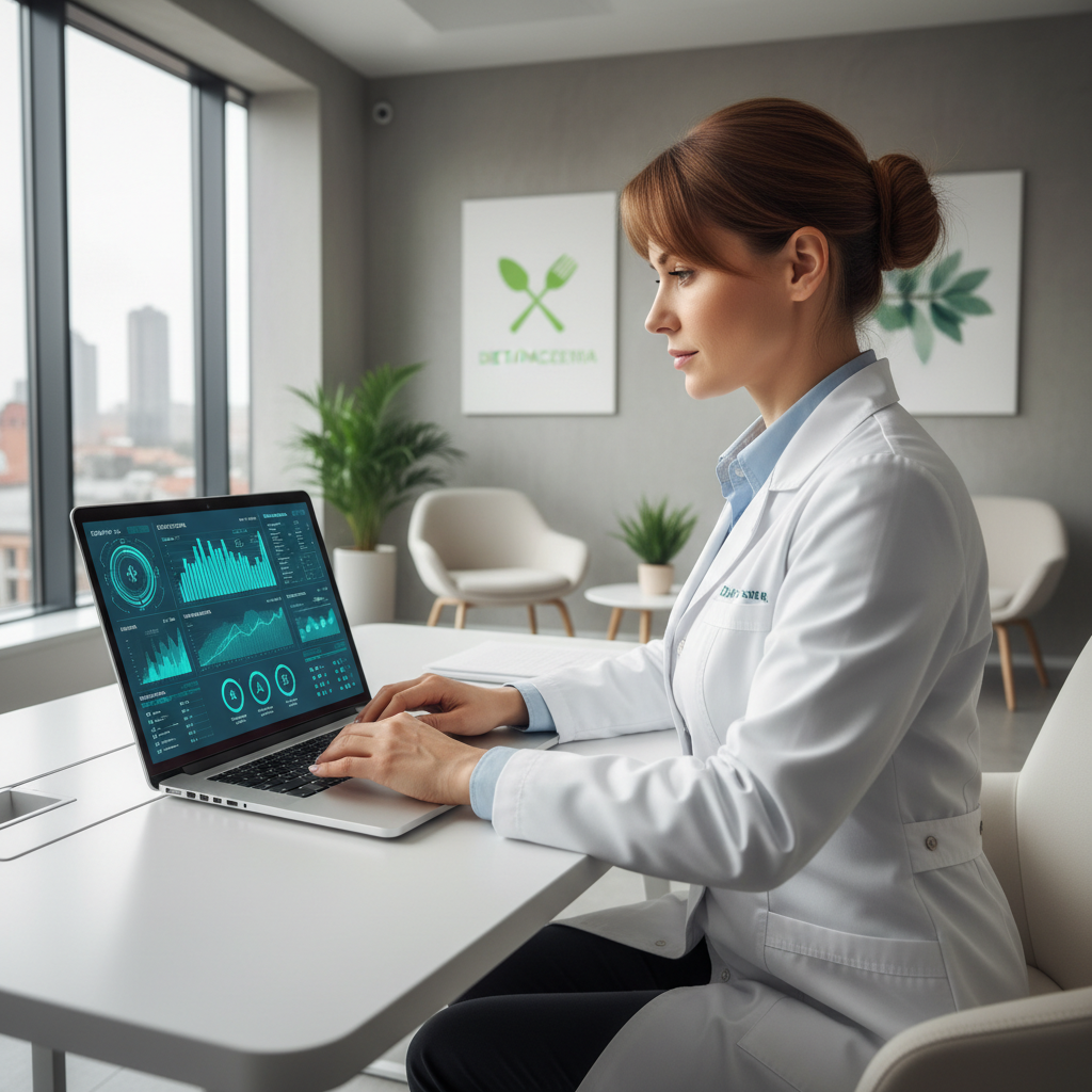 Nowoczesny dietetyk analizuje dane pacjenta za pomocą laptopa i notatnika, wykorzystując chatbota medycznego, co odzwierciedla cyfrową rewolucję w polskiej dietetyce.