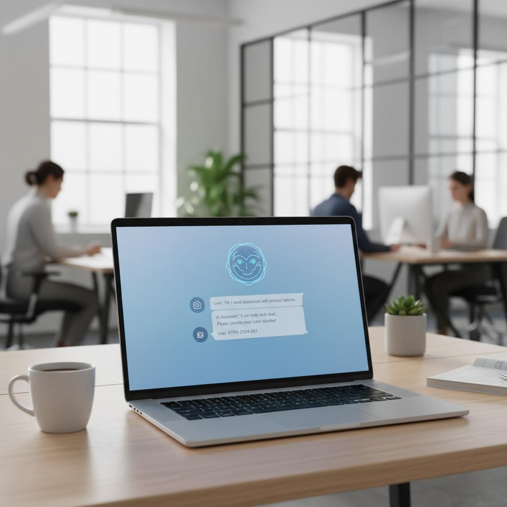 Zdjęcie przedstawia nowoczesnego chatbota afiliacyjnego rozmawiającego z klientem przez laptopa — kluczowe narzędzie we współczesnym affiliate marketingu.
