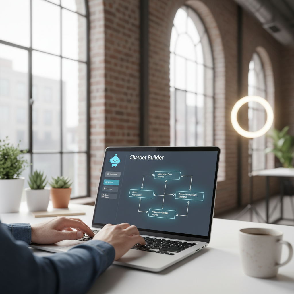 Widok kreatora chatbotów bez kodowania na laptopie – szybkie narzędzia pozwalają każdemu zbudować inteligentnego asystenta w kilka godzin.